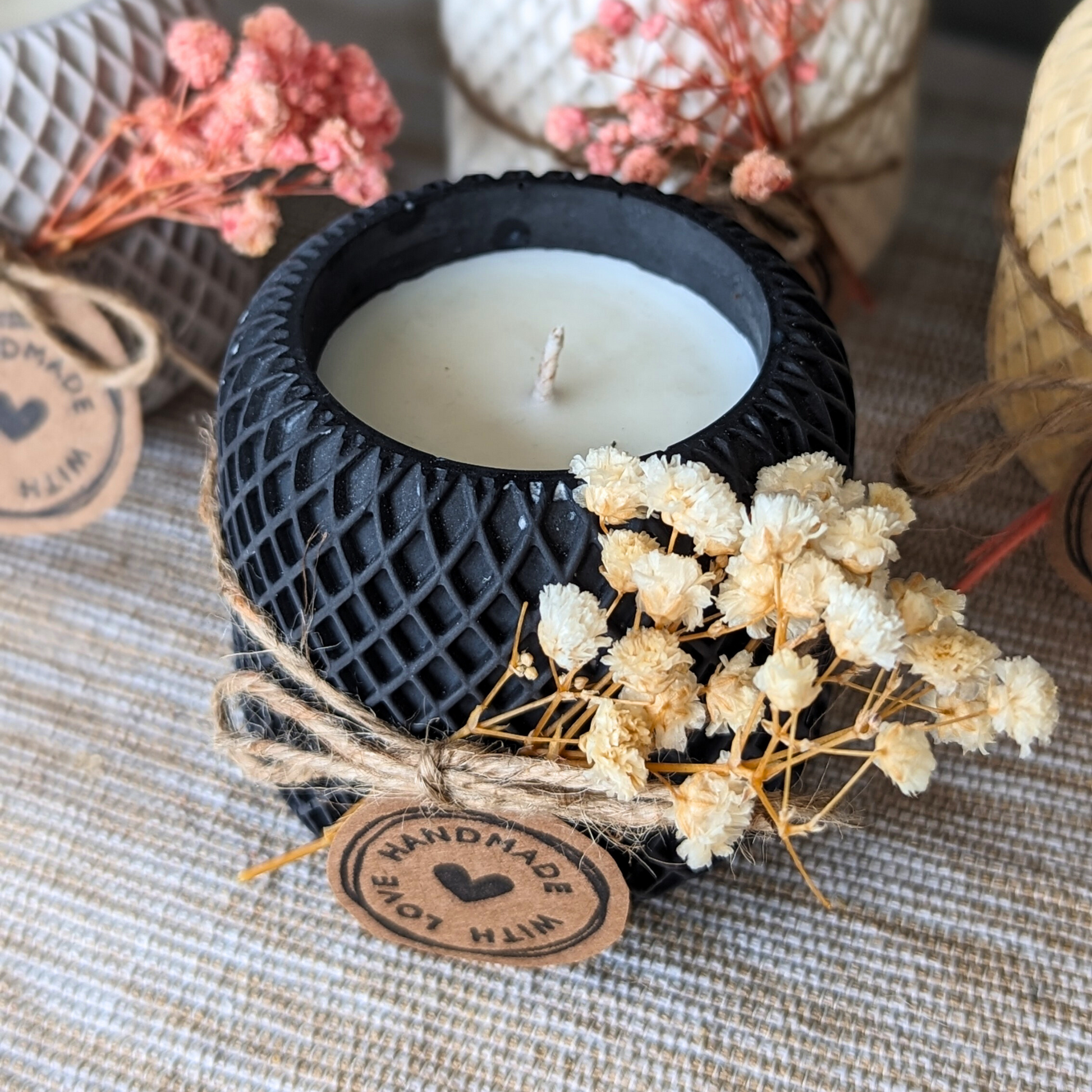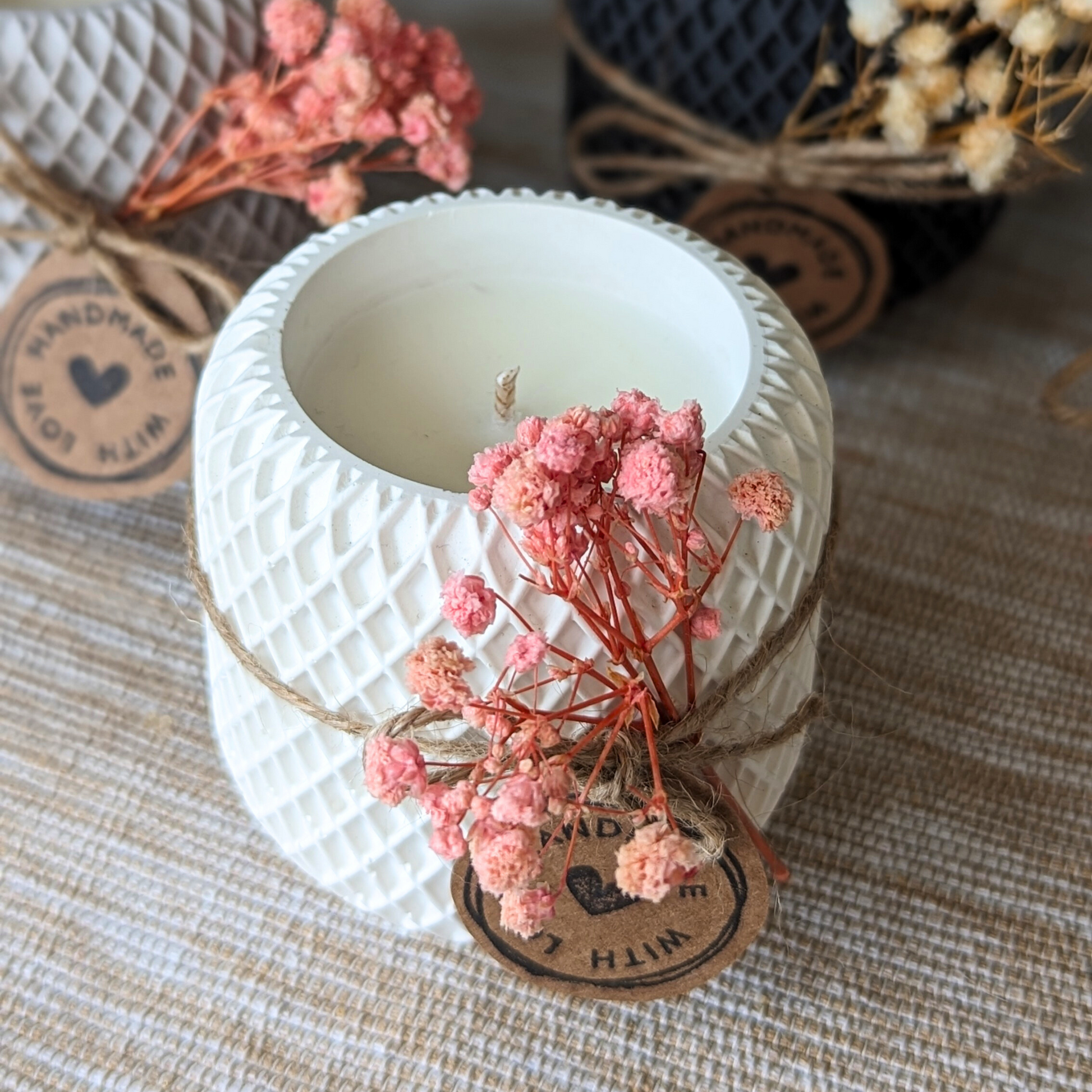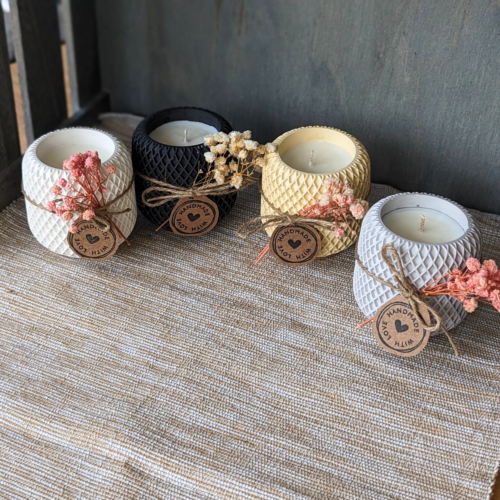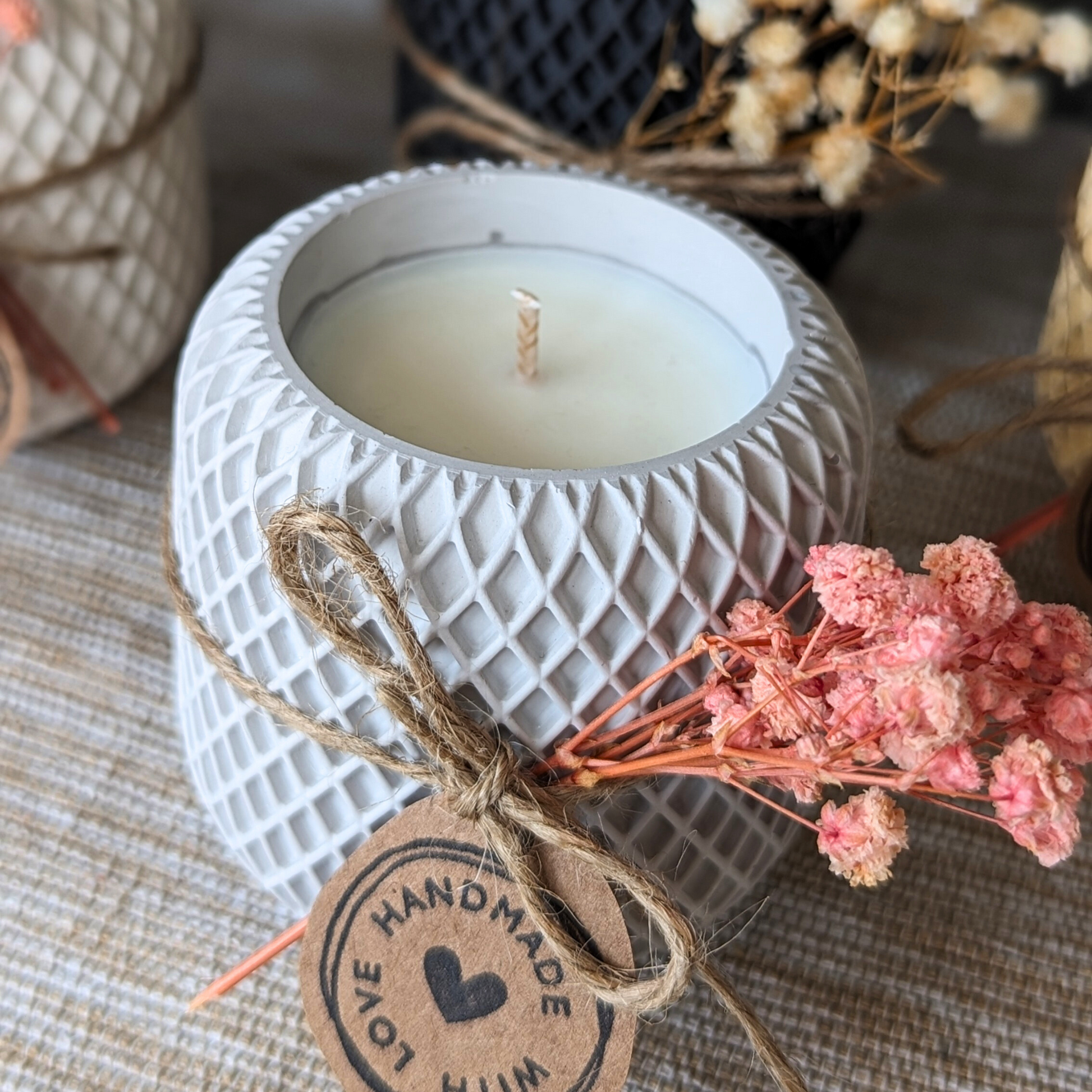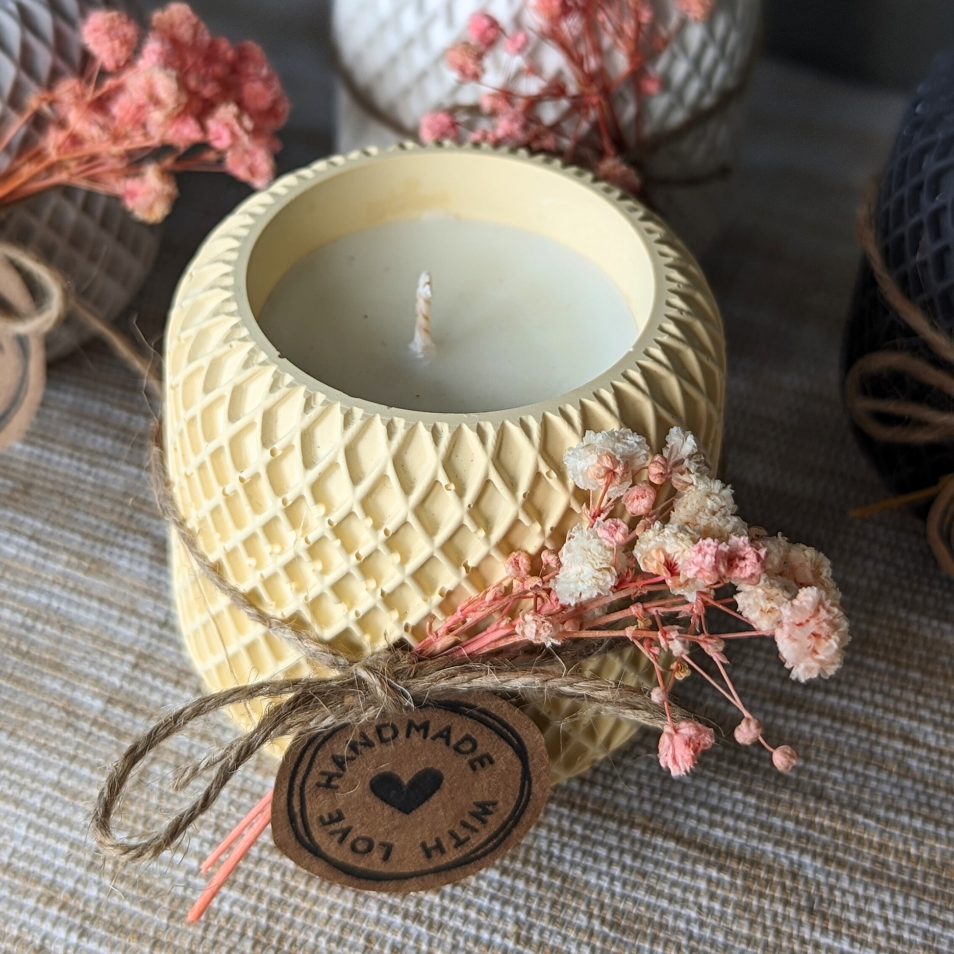 Meine Kerzen werden in werden in liebevoller Handarbeit in Gefäße aus einem Gießpulver der Firma Keracraft für Dich gegossen, geschliffen und versiegelt. Für den Schutz der Oberfläche deiner Möbel ist der Boden des Kerzenhalters aus Kork.
